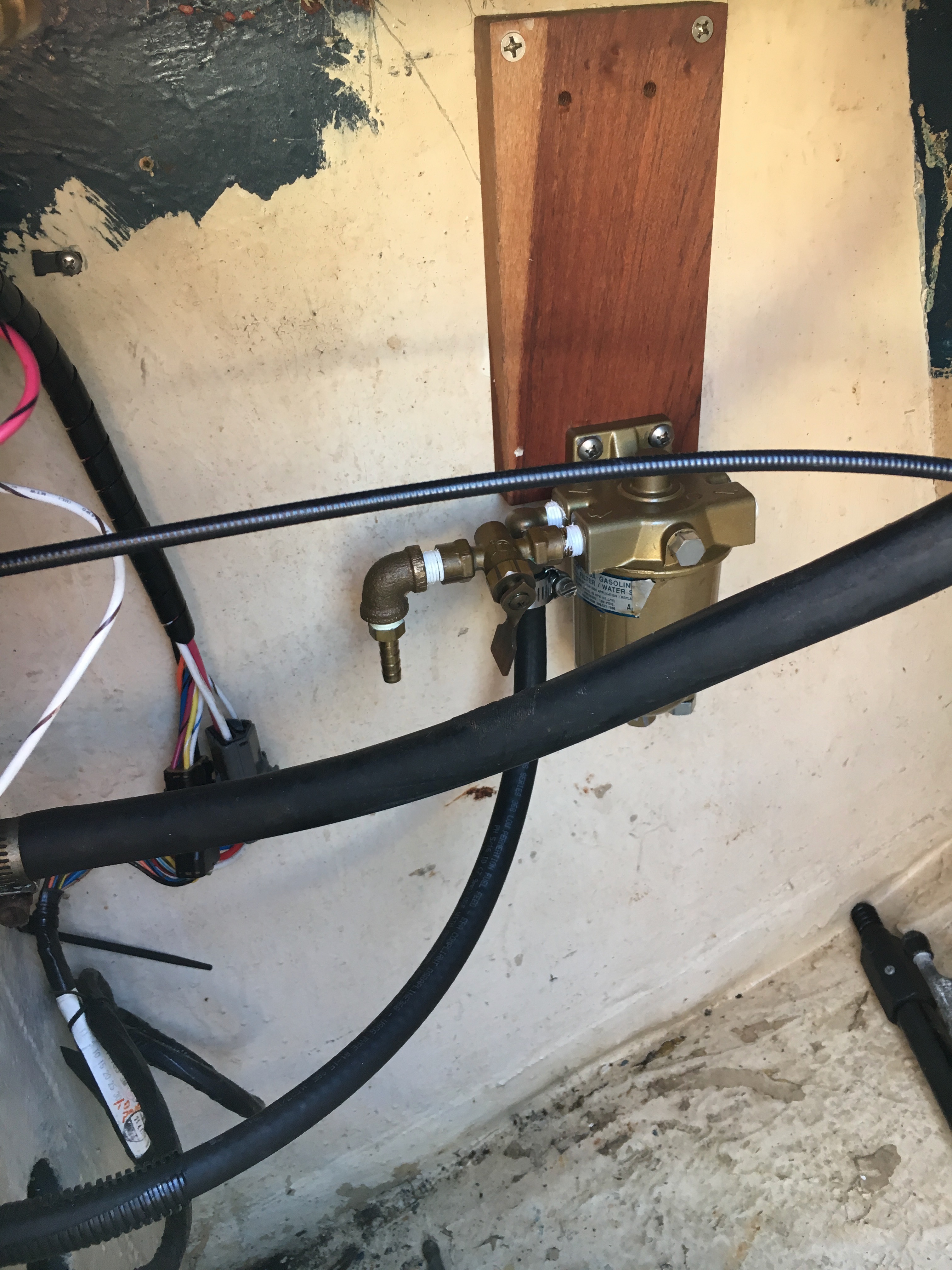 - The hose from the Racor 110A to the engine fuel pump is a single piece, as far as I know. Its surrounded with split loom. Not replaced.