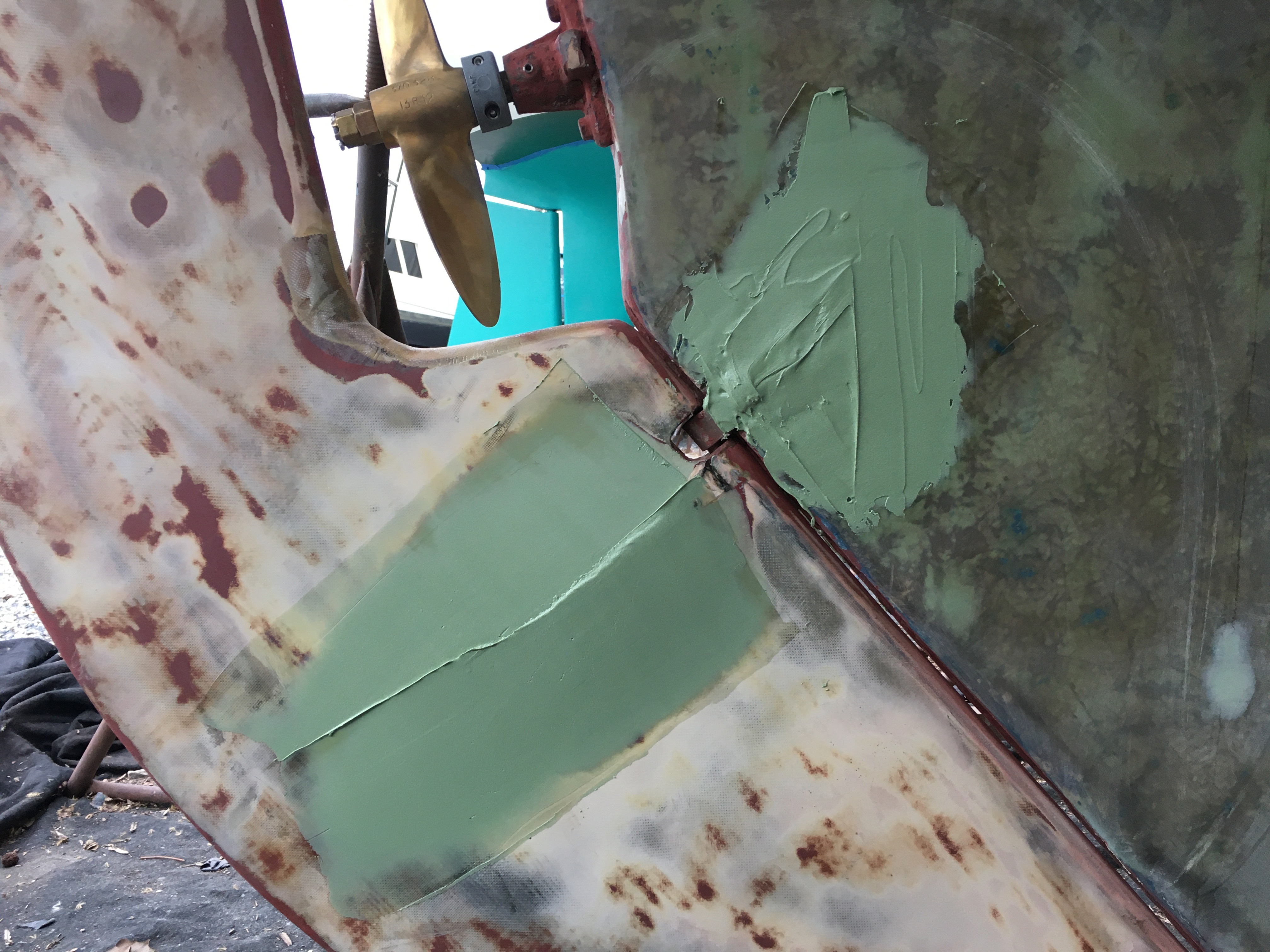 - Found that a previous owner failed to remove the tape used to mask the top edge of the epoxy barrier coat. Bits of the tape have been exposed by the longboarding. Broke a piece off and created a gouge at the top edge about two inches long, an eighth of an inch wide and too deep to ignore. The dark spot in the port bow photo below is the gouge overfilled. (Forgot about the gouge and had to scramble to fill it just before leaving.) See photo taken on 2022-04-05.