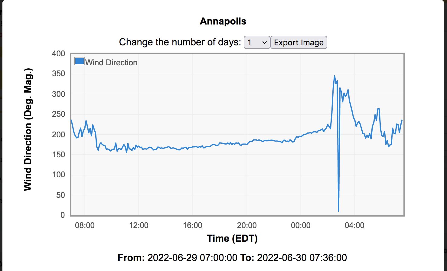 Tack back to starboard as we approached the shore, without a depth gauge, there's a definite tendency to tack earlier. At the first cross, Skybird was well ahead, perhaps six boatlengths. We had excellent speed on the starboard board, often well above polars. High tide was about 1745 at the Naval Academy, so it should not have played a major role in our speed at any time during the race. Weather buoy showed less than one-tenth of a knot for the duration of the race.